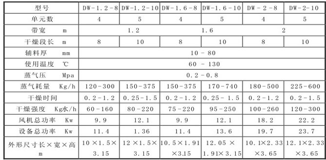 该机由输送装置、干燥箱、机架、风送装置、变速传动装置、排湿装置、余热回收装置、电控柜、振动筛等九部分组成。干燥箱内有多组往返运行的不锈钢网带,箱壳由内置保温材料的金属构件组成。物料经输送装置送入干燥箱顶层网带上,上下相反方向回转。物料自上层逐次落至下层,最后由第五组网带自卸料口卸出,经振动筛送至包装容器。当被干燥的物料在箱内运行的同时,热气流分层从网带由下而上穿过网带与物料充分接触,进行湿热交换,达到干燥物料的目的。该机的主体是不锈钢的网带,透孔率高达70%左右,且热气流几乎是垂直穿透物料,所以热交换较充分。空气介质分上、中、下层分别与物料接触,上层为高温气流与含湿量高的物料接触,使其能实现快速脱水的目的;中层为中温气流,使物料实现后期干燥。因该层气流穿透物料后,空气相对湿度不高,故部分循环回用;下层为室温气流,穿透物料层既降低了料温,又回收了部分热量,从而满足了许多食品和农场物料干燥工艺特性要求,确保物料的品质。机构设计合理、新颖,占地面积小,生产率高,具有节能效果显著、热效率高、实现冷态出料的优点。按供热方式分类有:燃煤式、蒸汽换热式、电热式。根据用户需要可配温度、湿度自动控制装置。